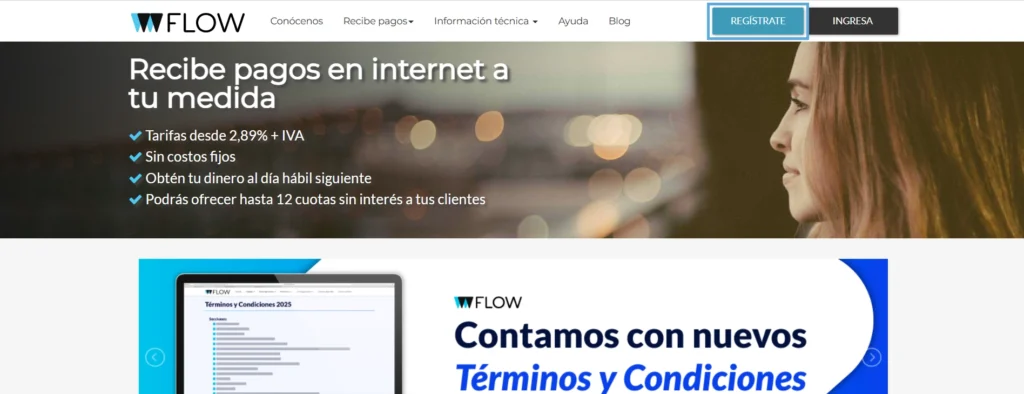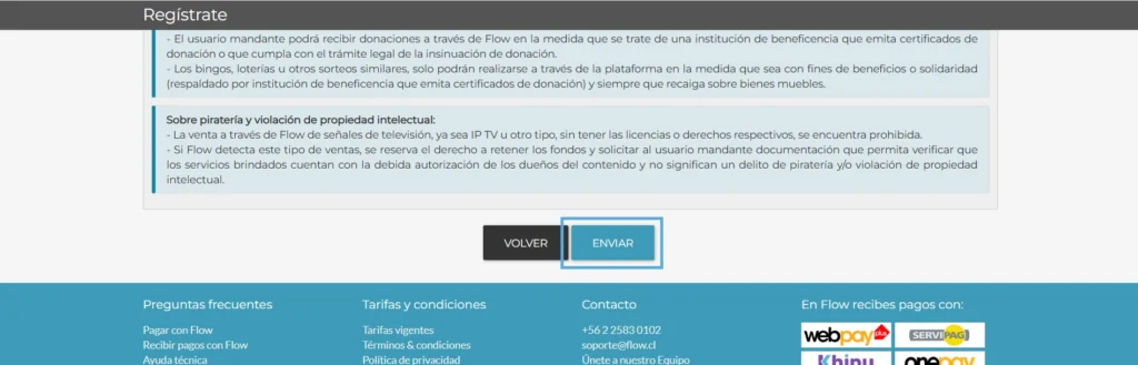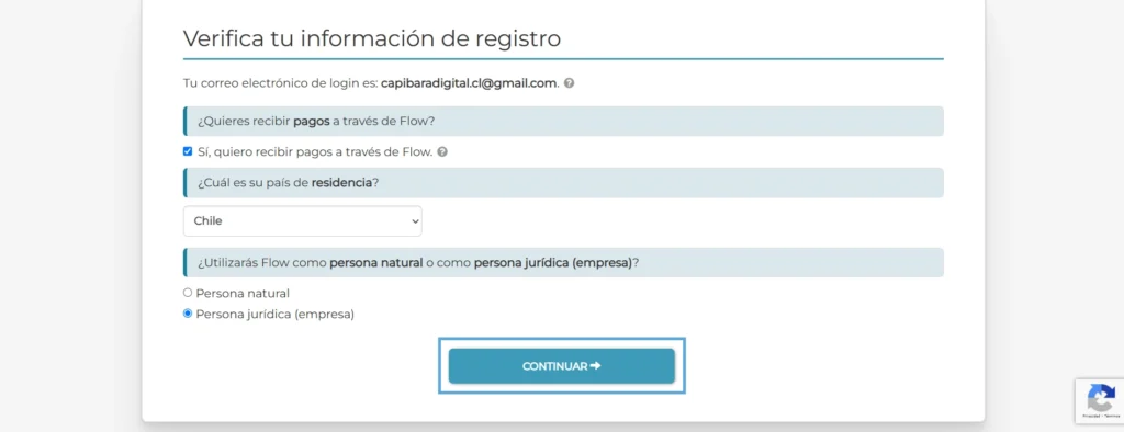 Flow te pedirá información relevante sobre tu emprendimiento o empresa, además de la cuenta en la que deseas recibir los pagos generados por tu web.