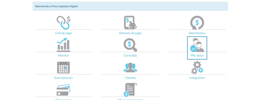 Desde tu panel en Flow.cl, haz clic en “Mis datos” (ubicado en el menú principal).